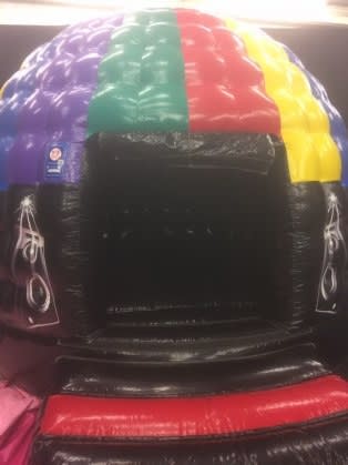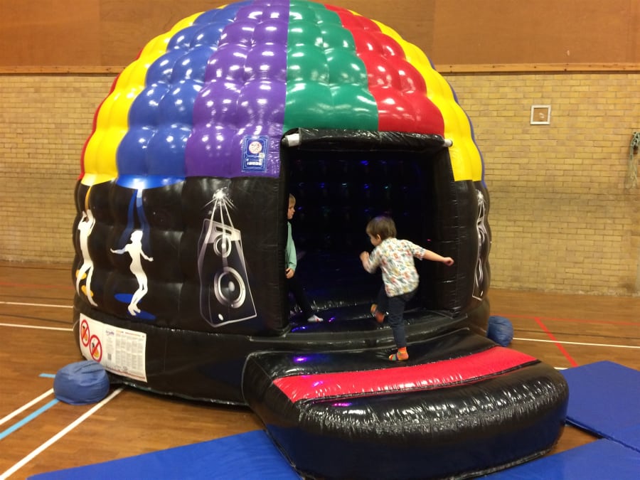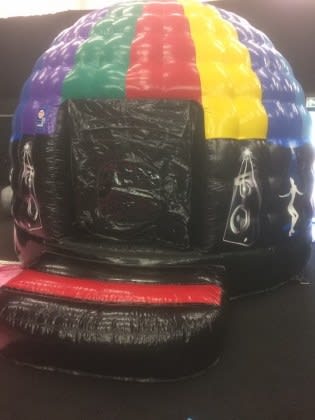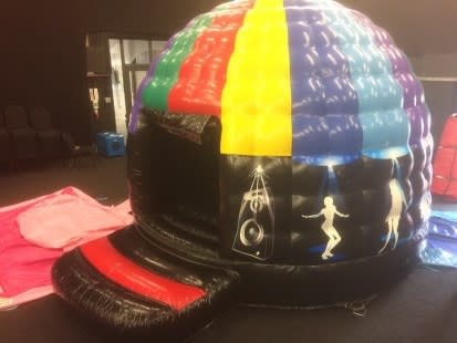 Weymouth bouncy castles latest exciting product is our fabulous mini disco dome. A great way of entertaining those under 8's at children's birthday parties, not only do you benefit from the bouncy castle bed to bounce on, but you get the a mobile disco or childs disco with flashing lights as well as music thrown in under the one roof . Disco dome parties are available in Weymouth, Dorchester and the surrounding areas of Dorset. This inflatable bouncy disco dome is absolutely fantastic and children love them. Available all over Dorset for Children's parties and events, with its brightly coloured dancing people around bouncy base it catches the eye of all that see. Once the children enter the bouncy disco dome they become enchanted by the spinning light discharging an array of bright beams of flashing colours on to the inner walls and bouncy bed as it rotates to the music's beat. The music can be of any sensible volume, but children seem to enjoy it most when its thumping at its loudest with the light pulsing beams of light the beat of your chosen music, creating your very own bouncy castle disco party. Music is easily bluetoothed through the speaker from any device so children can have their very own playlist or we can provide a usb