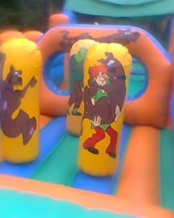 This fantastic 50ft inflatable obstacle course is the ultimate multiplay inflatable and is the most exciting inflatable attraction at any event because children just love the adventure and physical challenge that it provides. This assault course is ideal for village fetes, fun days, school fetes, holiday camps, corporate events, private parties, charity events, weddings, bqs the list is endless. Children enter at the start,scrambling in through the two arches, they then enter a bouncing area with inflatable biff n bash with characters painted all over them, once they have pushed the biff bash a side they climb through two holes into another bouncing area. Here they bounce and wait there turn to climb to the top of the slide on foam steps. They then reach the top and slide down FEET FIRST to the bottom of the slide were they exit the inflatable at the side and run back to the start. This will wear out even the fittest of children out. The inflatable obstacle course is the ultimate bouncy castle and is must for any childs party.