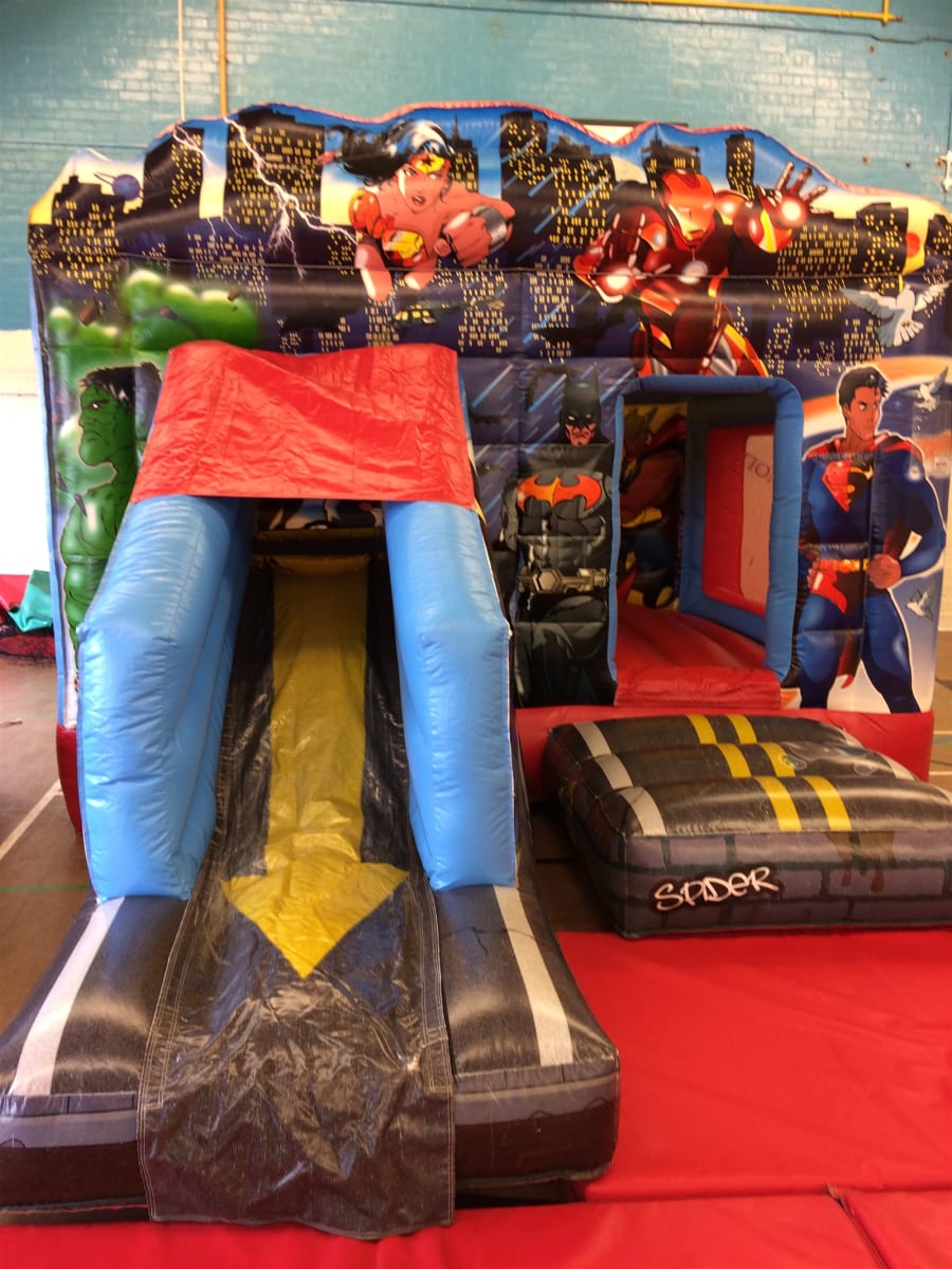 Superhero Bouncy castle with slide, super hero soft play , air juggler superhero ball pool and matching didi cars party package.