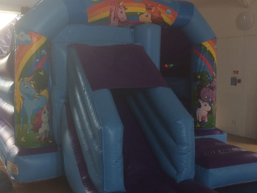 UNICORN DISCO BOUNCY CASTLE & SLIDE FOR WITH LARGE DIDI CAR RACETRACK FOR HIRE IN WEYMOUTH AND DORSET.