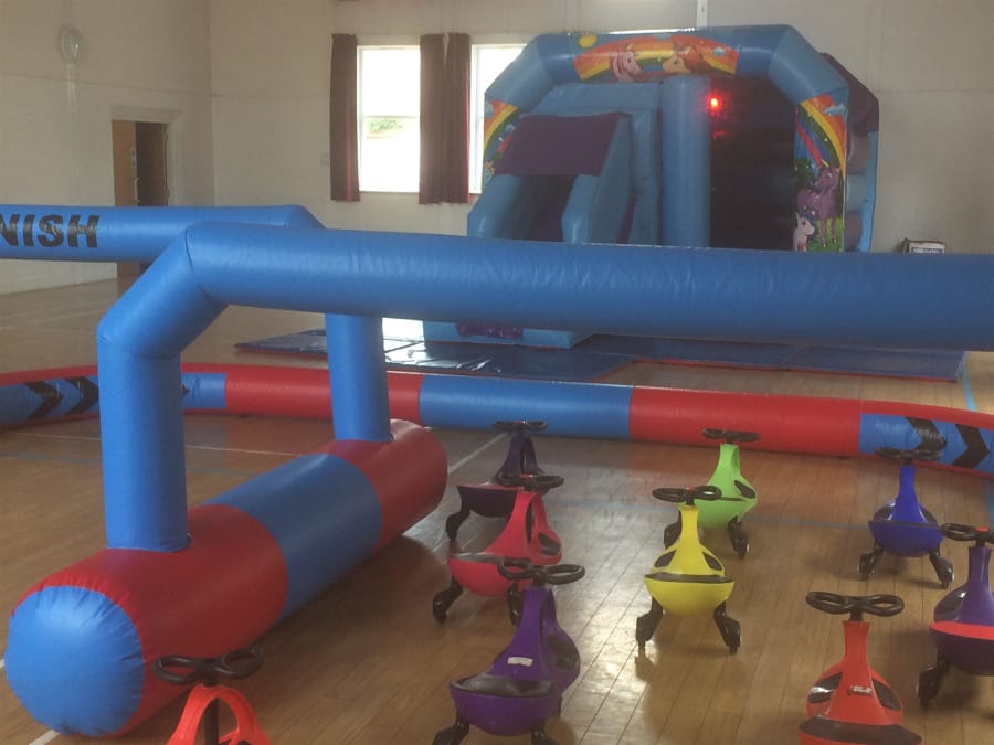 This awesome unicorns themed bouncy castle disco slide combo is a must for any child’s party. Available to hire in Weymouth and Dorset with its LED flashing disco lights and amazing music speaker, you get the ultimate bounce, boogie and slide party. This package is further complimented by the matching colours of our amazing Didi car racing track, and colour coordinated swing cars. Fantastic fun for kids of varied ages, and even better still - it can be available for hire in the fantastic Stratton village hall near to Dorchester in Dorset.